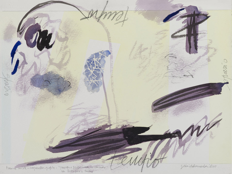 Gabriele Amadori (Ferrara 1945) Progetto per performance in concerto con Stefano Battaglia e Michele Rabbia Tecnica mista, acquarello e grafite Firmato e datato 2010 Senza cornice Misure 58x76 cm