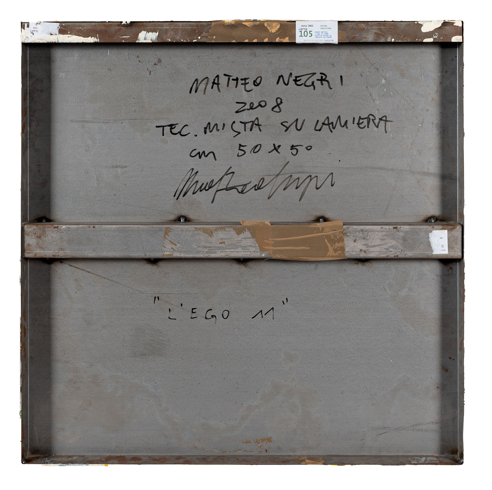 MATTEO NEGRI(1982)L'ego 112008Applicazioni e tecnica mista su lamiera56 x 56 cmFirma, data e titolo al retroOpera accompagnata da certificato di autenticità a cura di Fabbrica Eos, Milano e firmato dall'artistaPROVENIENZA:Collezione privata, MilanoESPOSIZIONI:6 febbraio - 20 marzo 2009, Regards to time and space, S & G Arte Contemporanea, Berlino