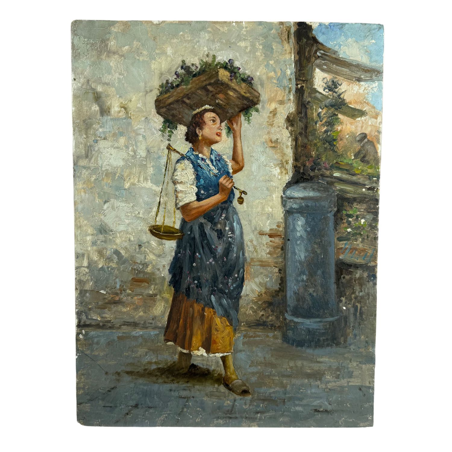 Dipinto olio su tavola, periodo XX secolo (1940 - 1950) scuola Italiana, raffigurante La venditrice. Dimensioni: 30x40 cm. Da artista anonimo. Opera in buone condizioni e di ottima qualità artistica.