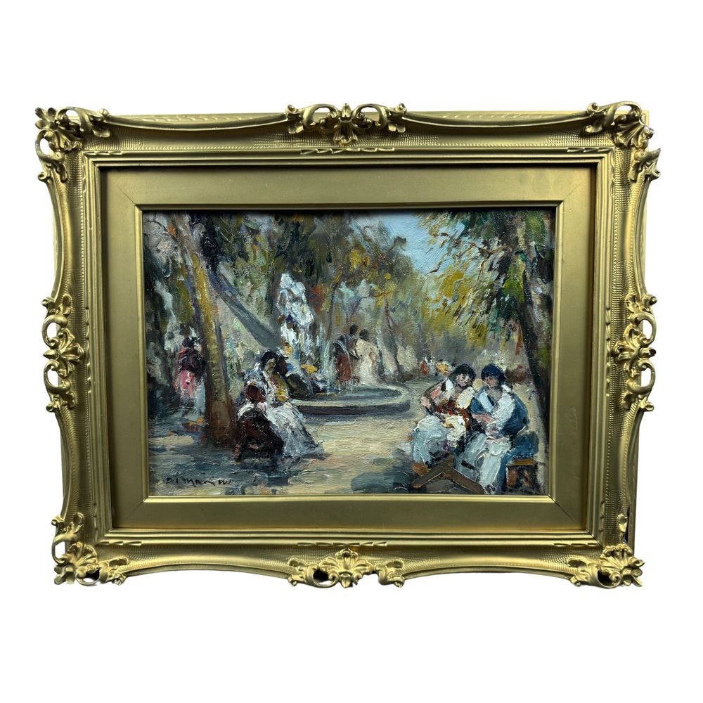 Dipinto olio su tavola, periodo XX secolo scuola Italiana, raffigurante Personaggi. Dimensioni interno cornice: 35x25 cm. Dimensioni compreso cornice: 50x40 cm. Reca firma in basso a sinistra da Di Marino. Opera in buone condizioni.