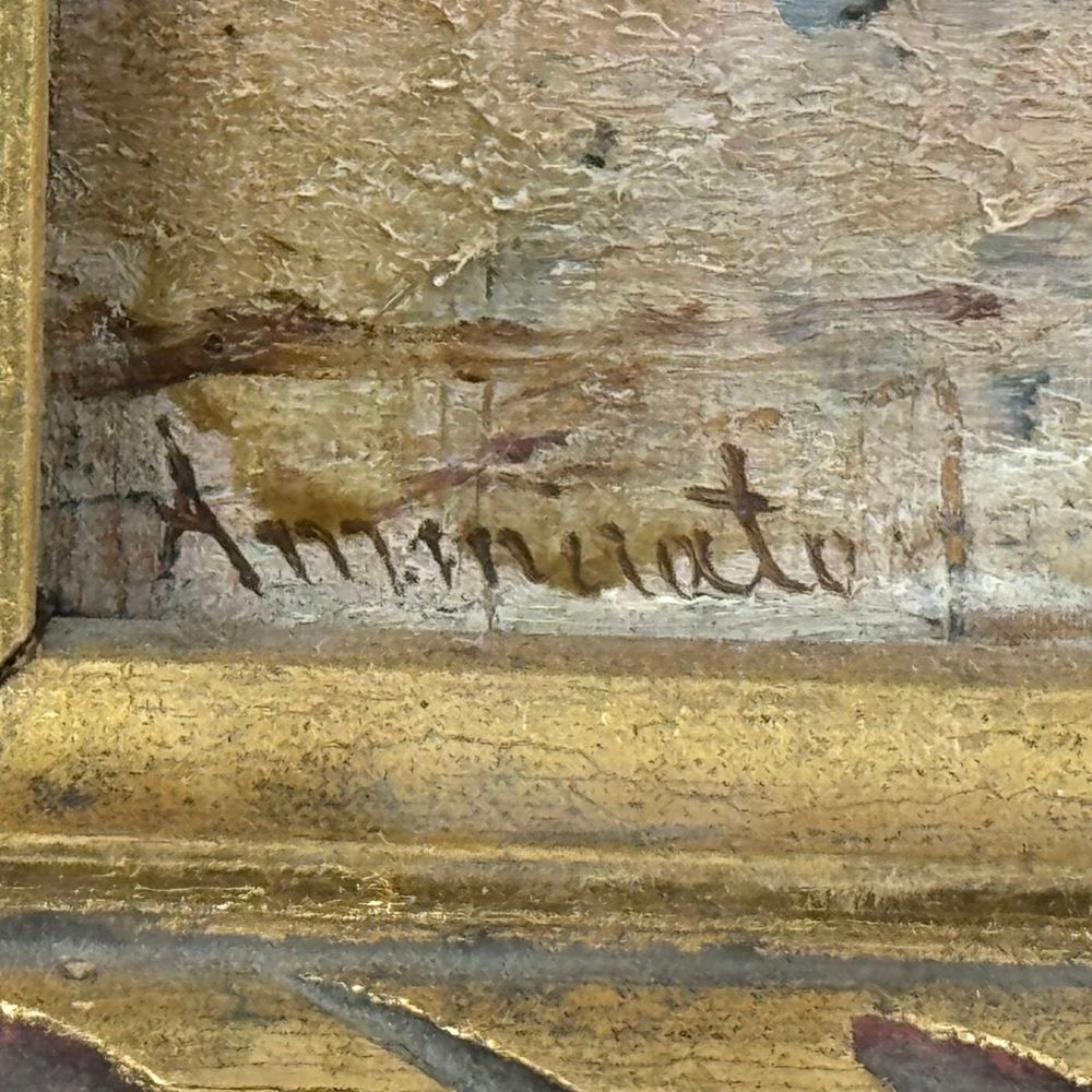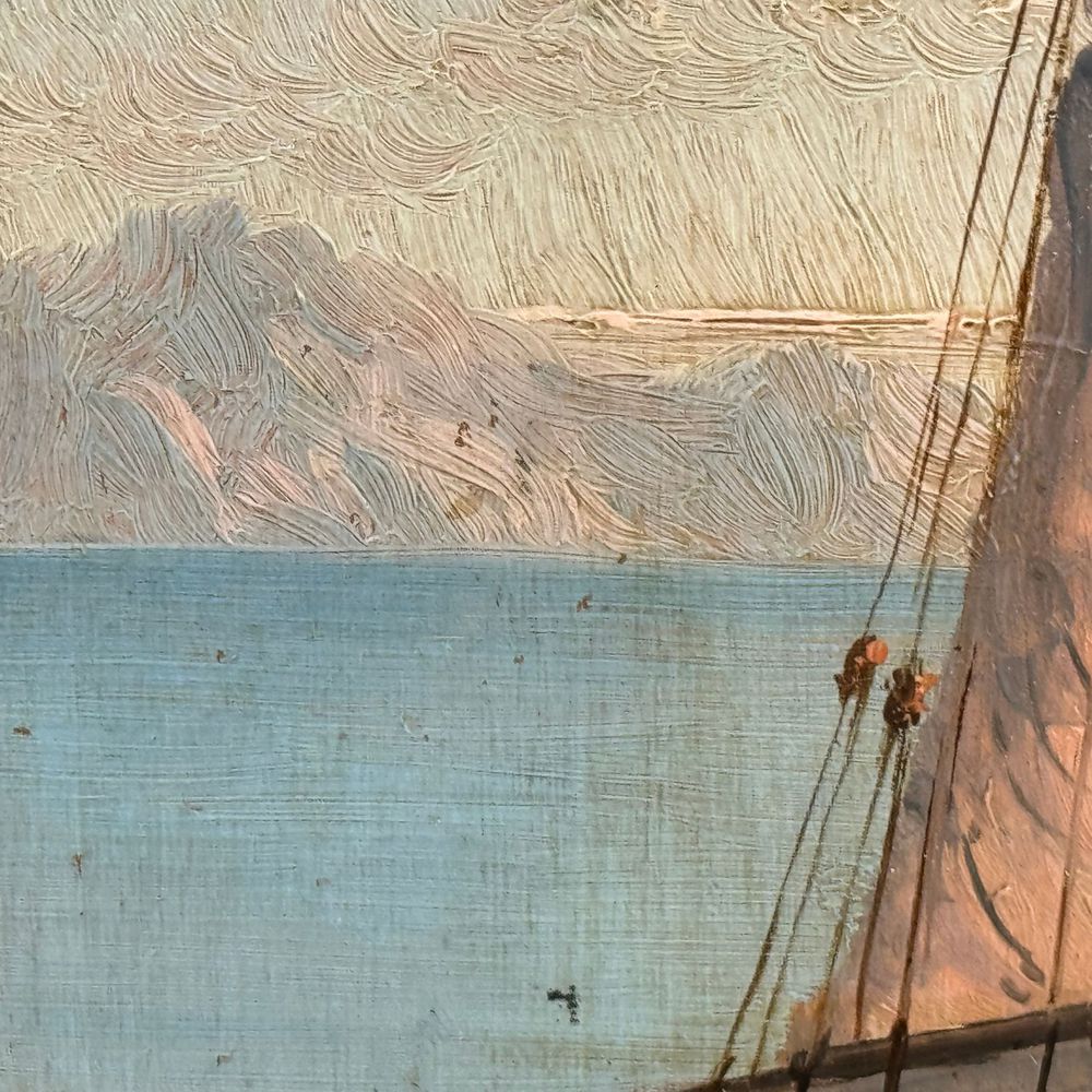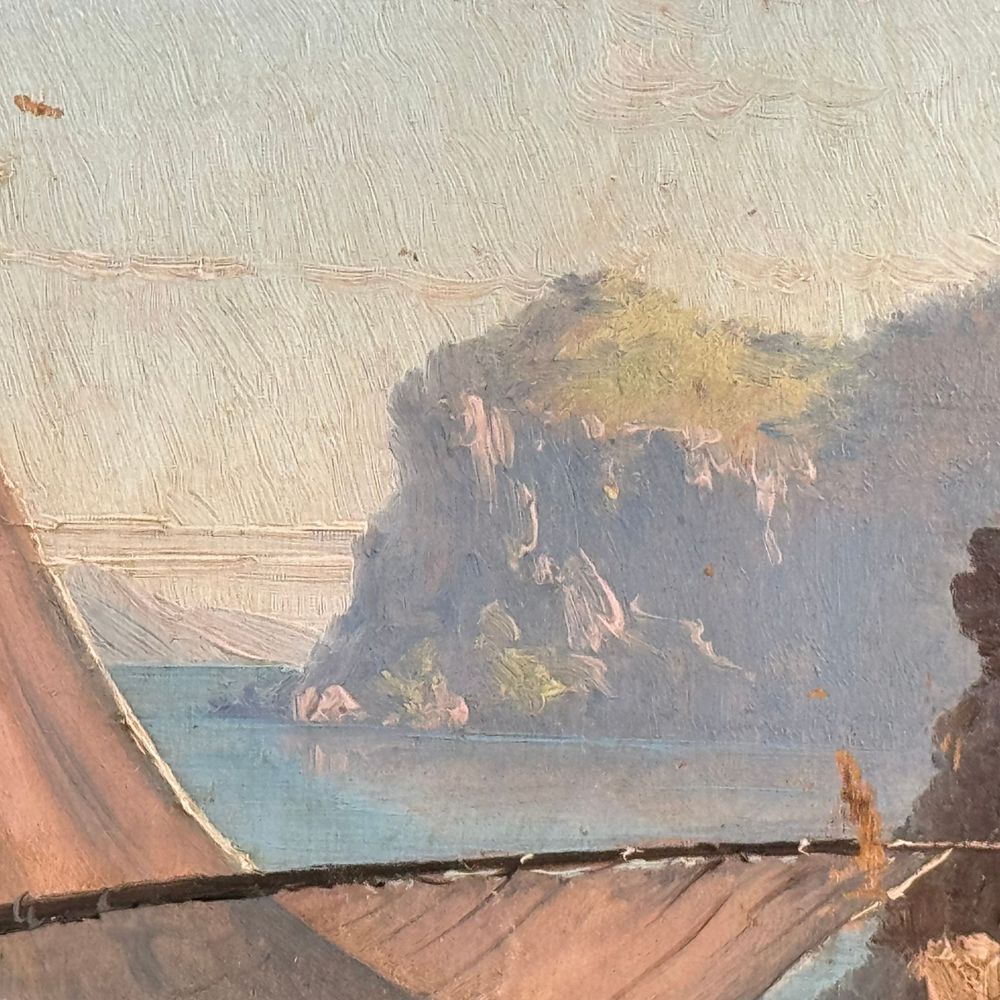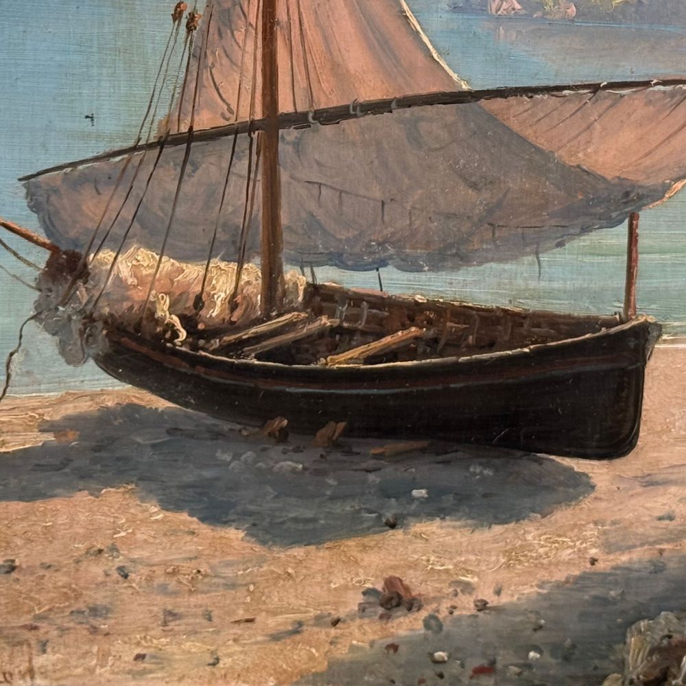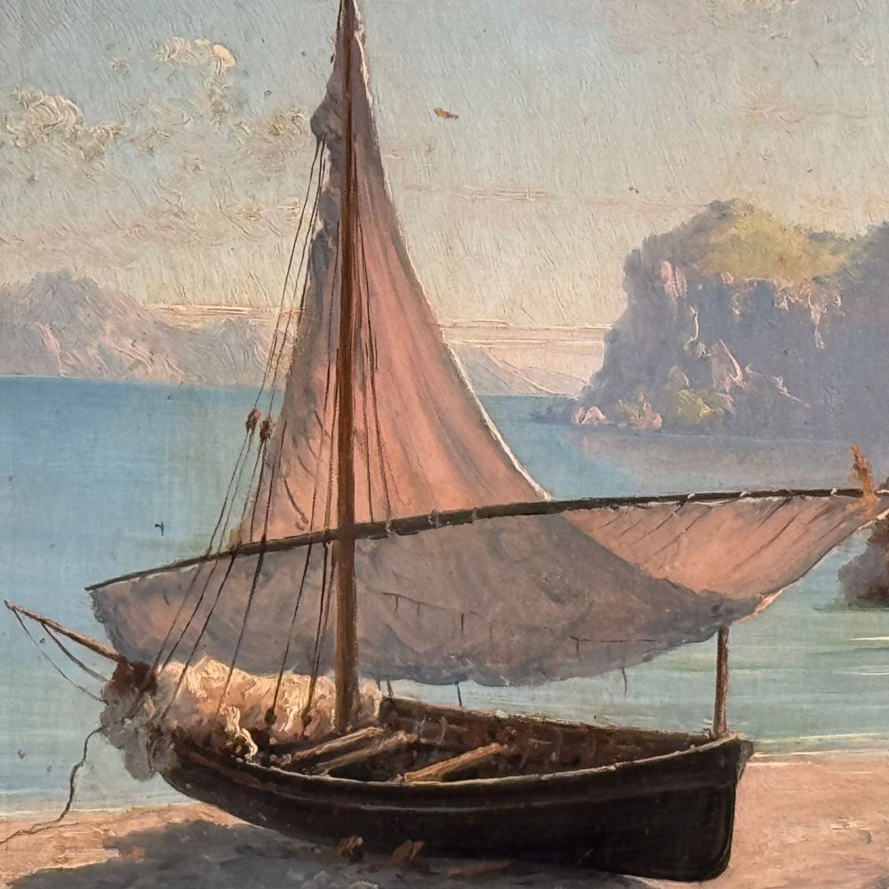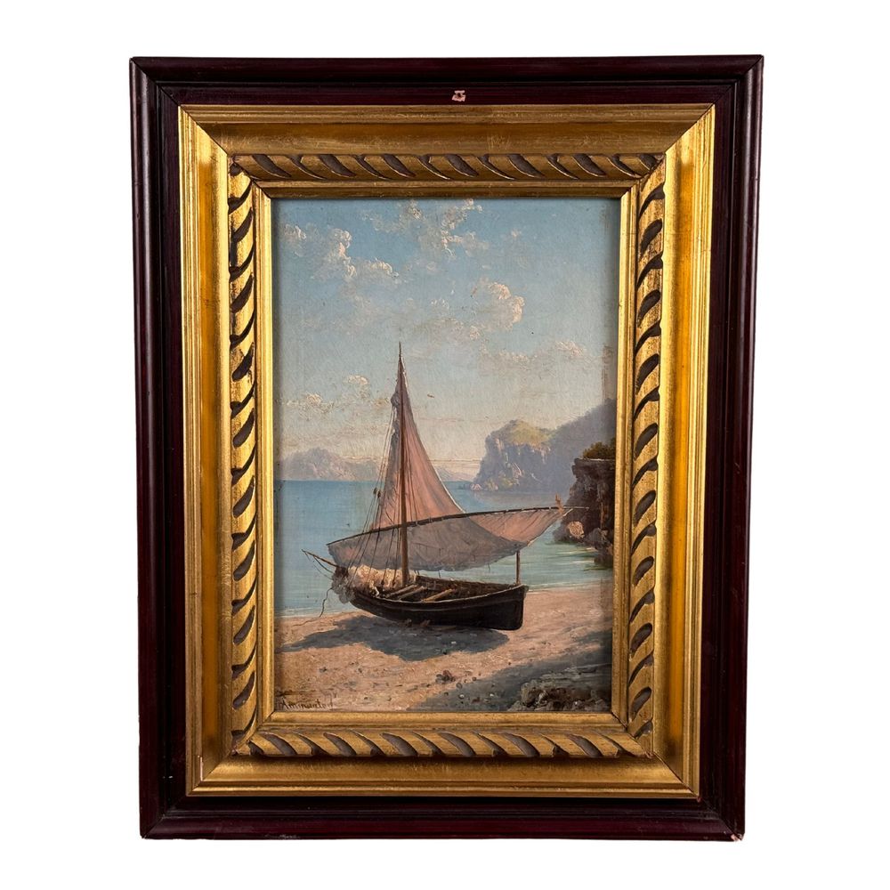 Dipinto olio su tavola, periodo XIX secolo, scuola Italiana, raffigurante Veduta della costiera con barche a secco. Dimensioni interno cornice: 20x29 cm. Dimensioni compreso cornice: 34x43 cm. Reca firma in basso a sinistra da Domenico Ammirato. Opera in buone condizioni. Domenico Ammirato (Napoli, 1833 – dopo il 1891) si forma presso il Real Istituto di Belle Arti di Napoli, sotto la guida di Gabriele Smargiassi (1798-1882). Ben presto dunque, si avvia alla pittura di paesaggio, seguendo per lungo tempo i precetti del maestro.