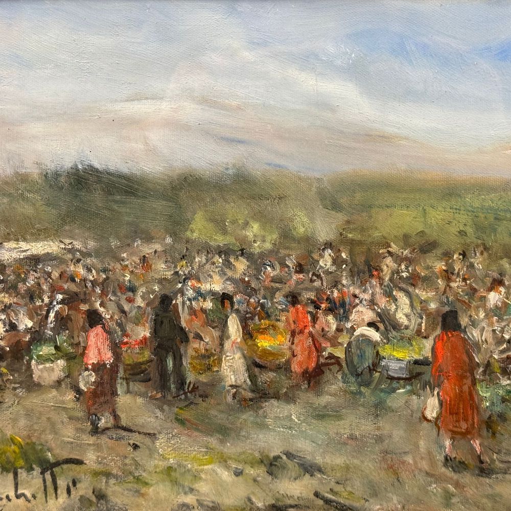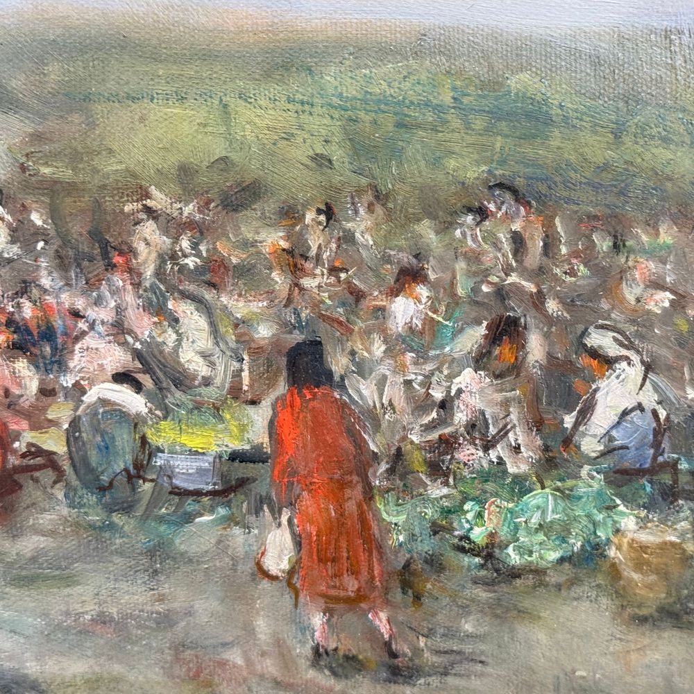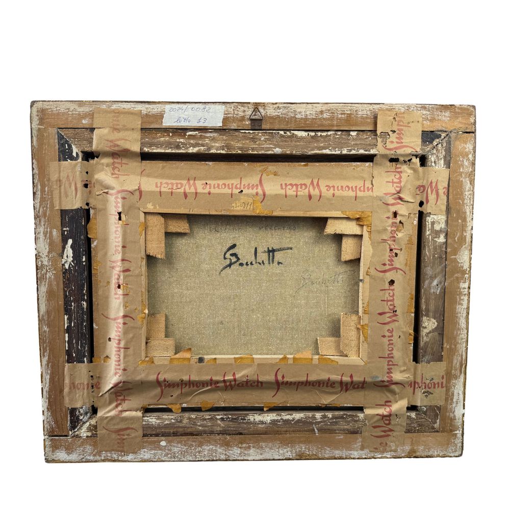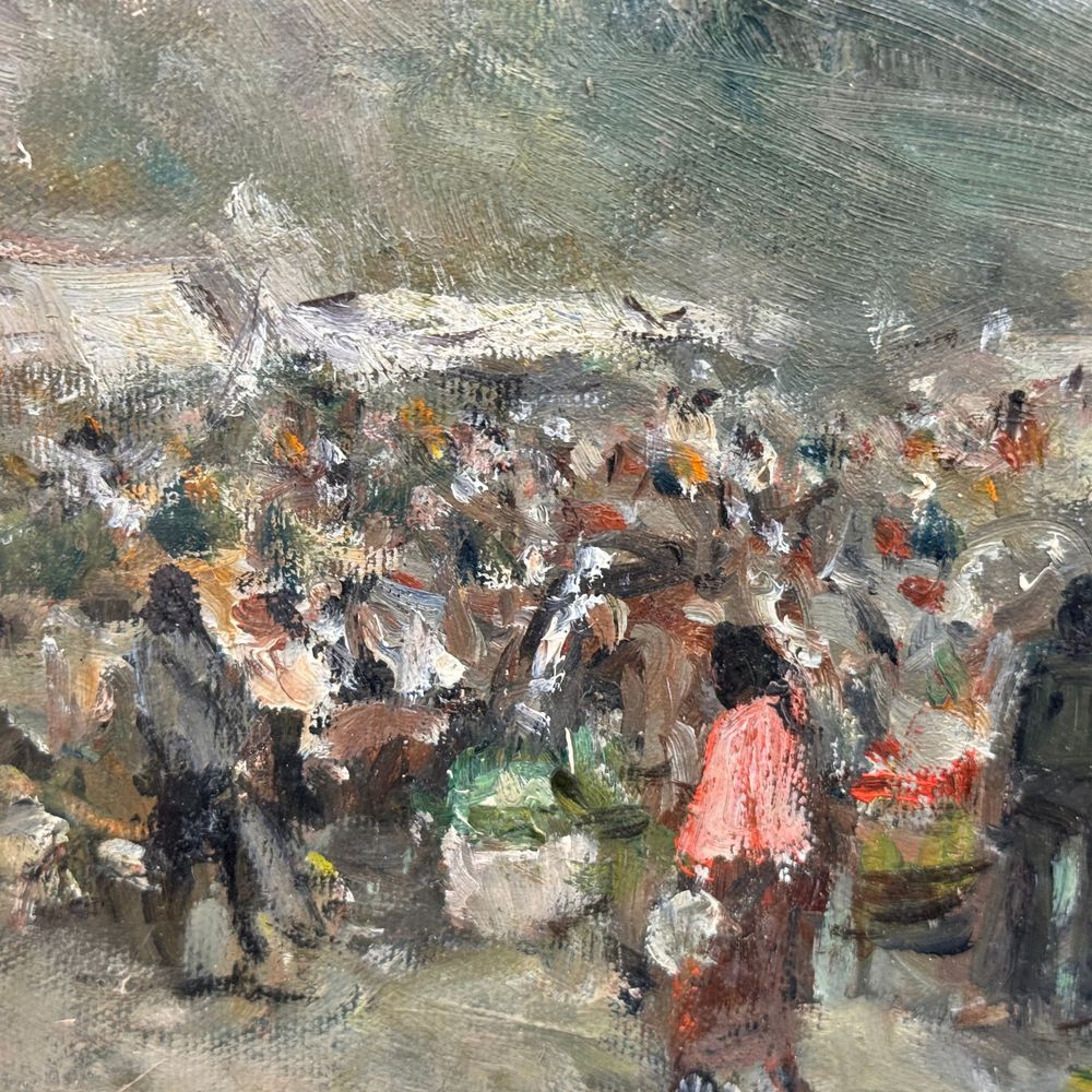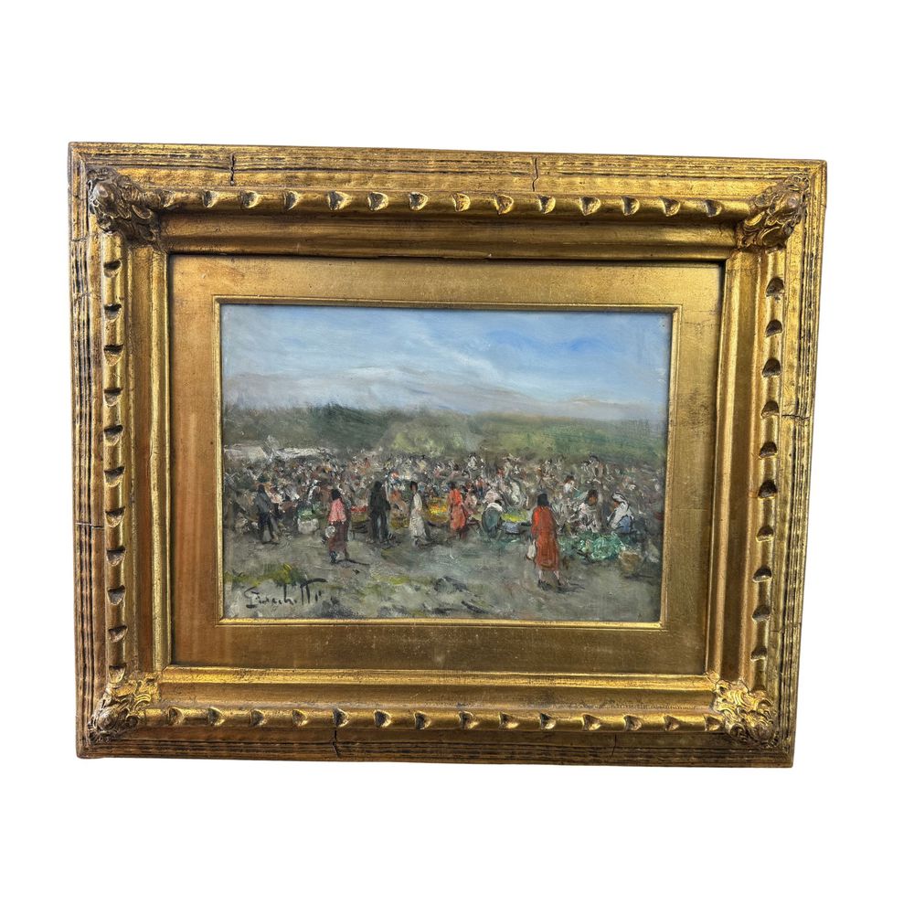 Dipinto olio su tela, periodo XX secolo scuola Italiana, raffigurante scena di mercatino. Dimensioni interno cornice: 35x25 cm. Dimensioni compreso cornice: 48x58 cm. Reca firma in basso a sinistra da G. Bocchetti. Opera in ottime condizioni. Cornice con lievi difetti come da foto allegate.