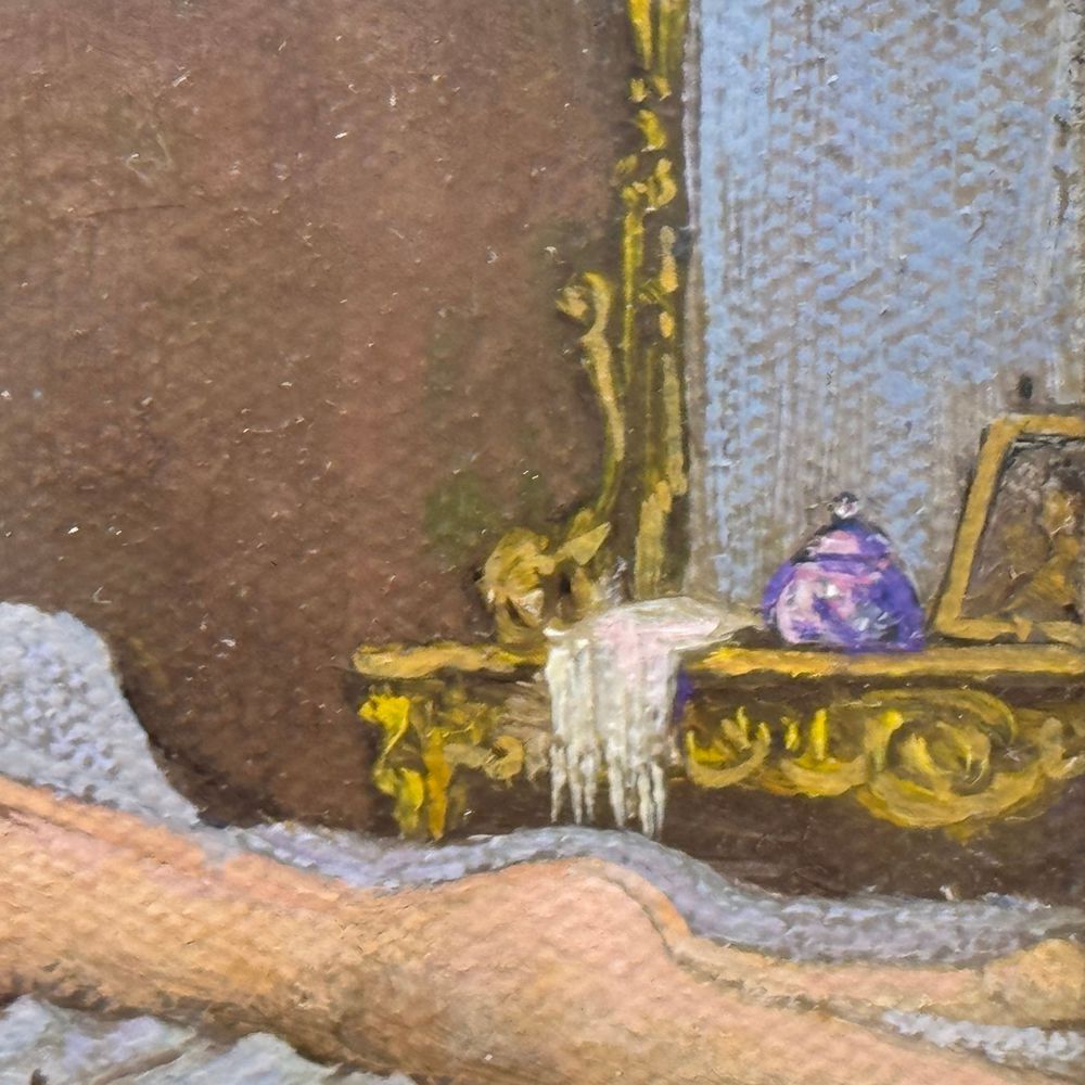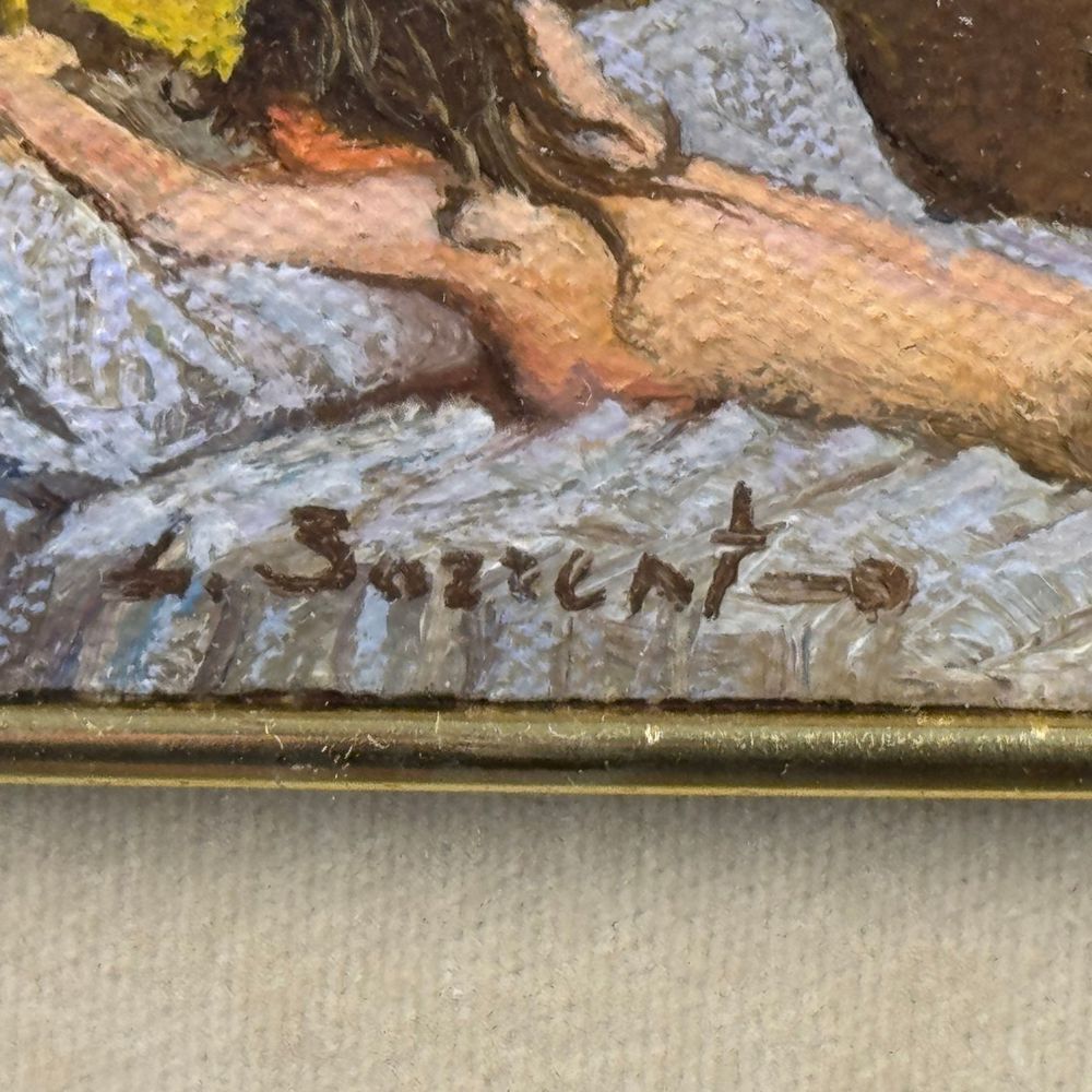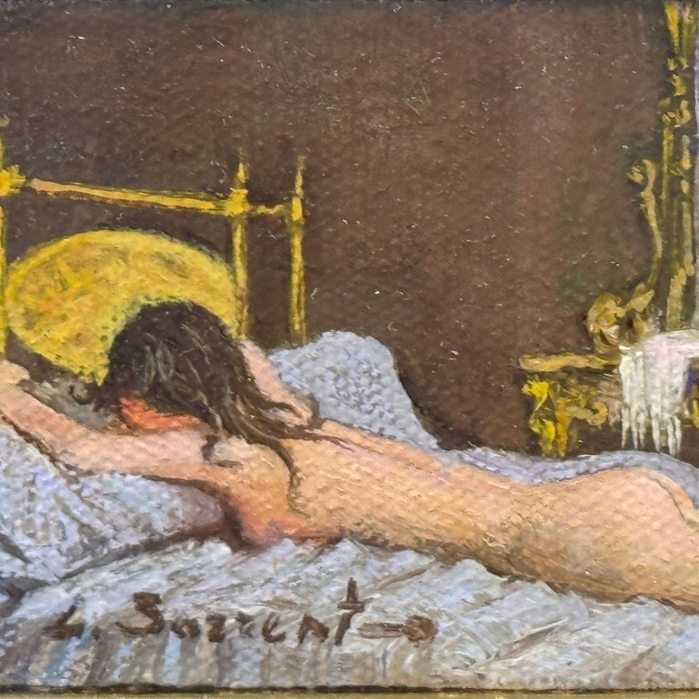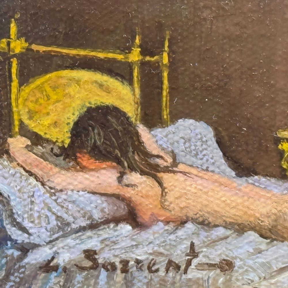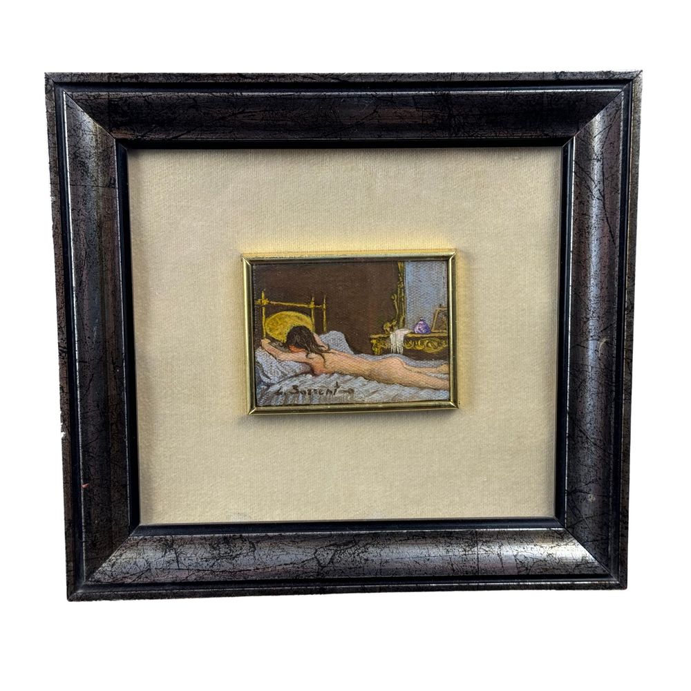 Dipinto olio su pannello, periodo XX secolo scuola Italiana, raffigurante Nudo di donna. Dimensioni interno cornice: 6x7,5 cm, dimensioni compreso cornice: 22x20 cm. Firma in basso a sinistra da L. Sorrentino. Opera in buone condizioni.