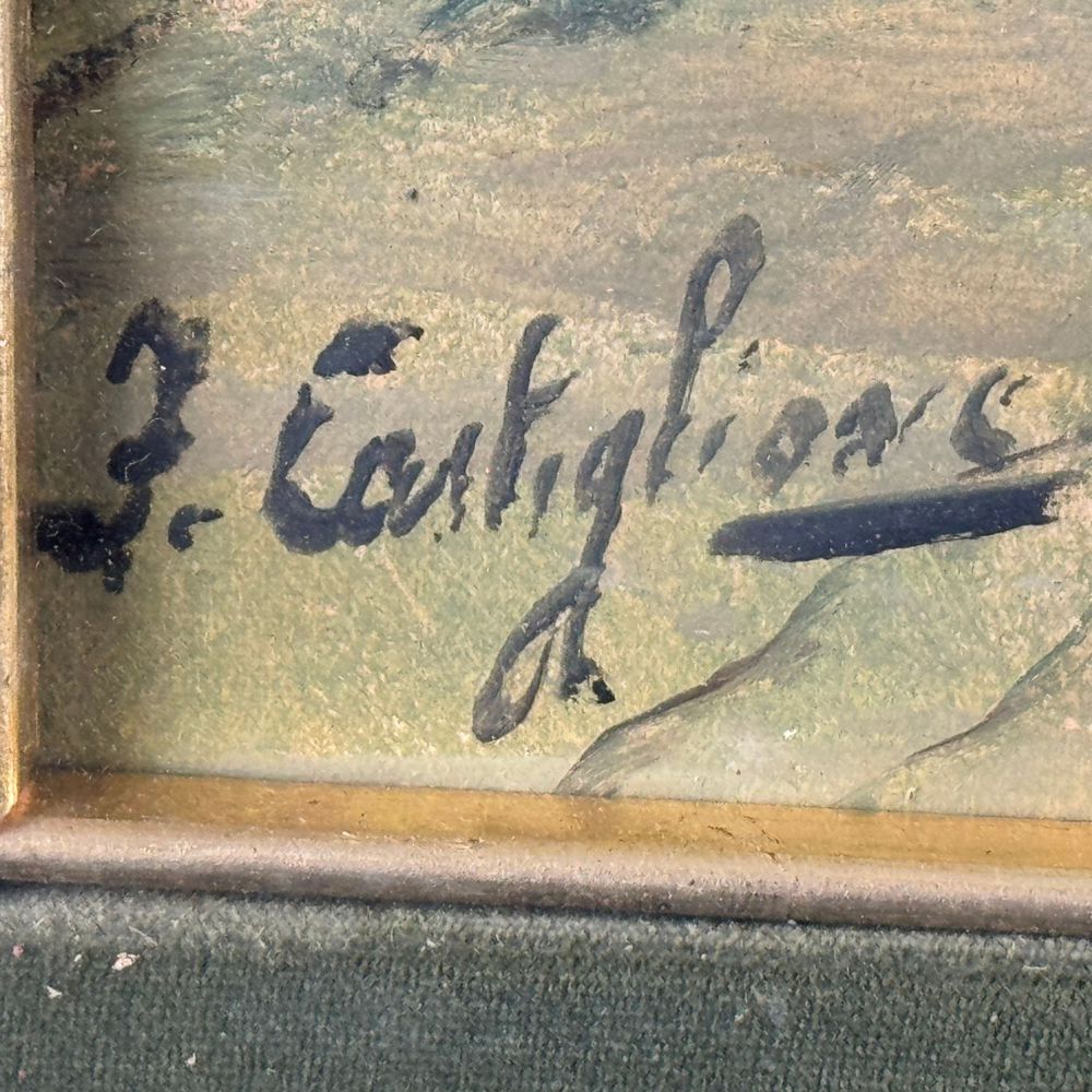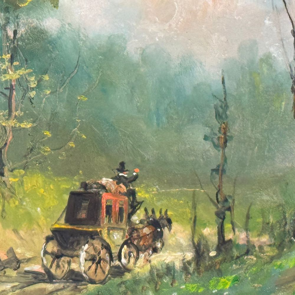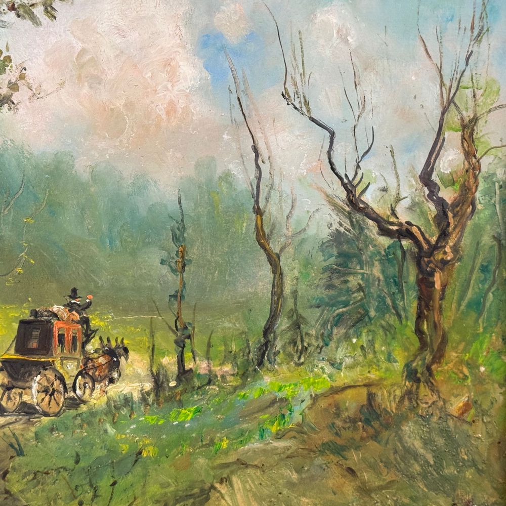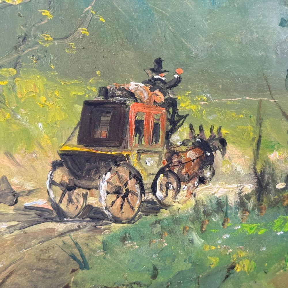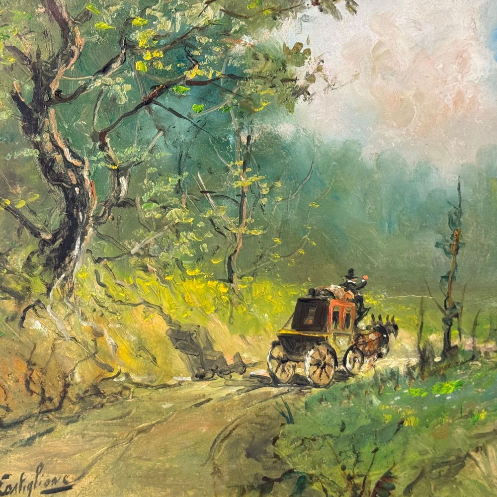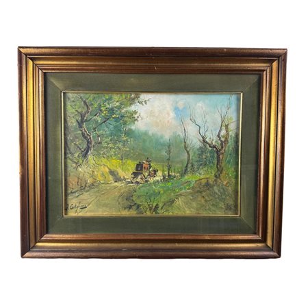 Dipinto olio su cartoncino, periodo XX secolo scuola Italiana, raffigurante Strada di campagna con carrozza. Dimensioni interno cornice: 50x35 cm. Dimensioni compreso cornice: 70x55 cm. Reca firma in basso a sinistra da Castiglione. Opera in buone condizioni.