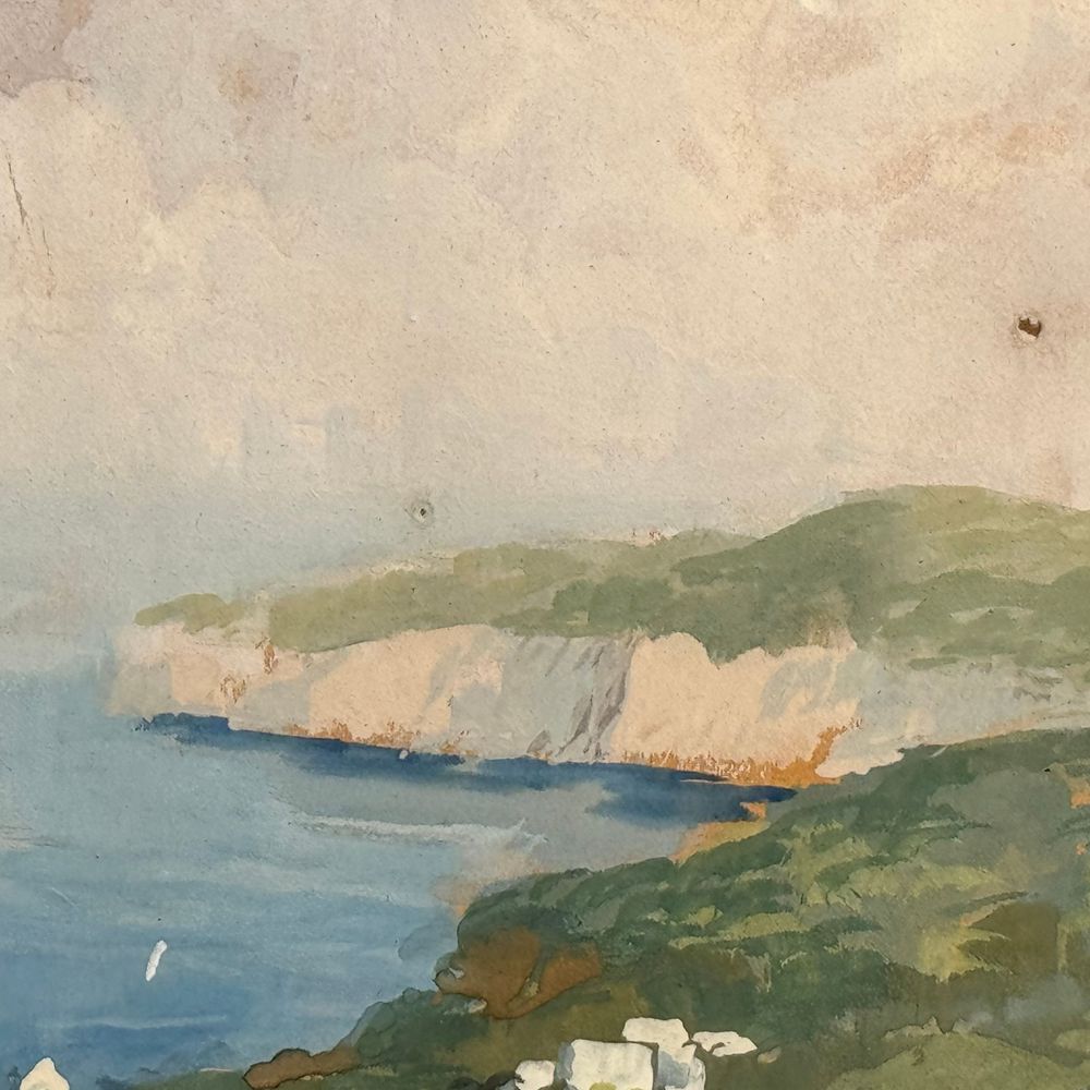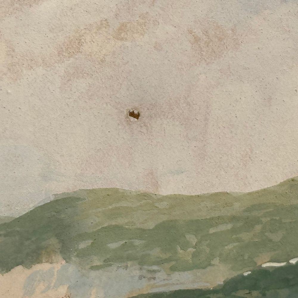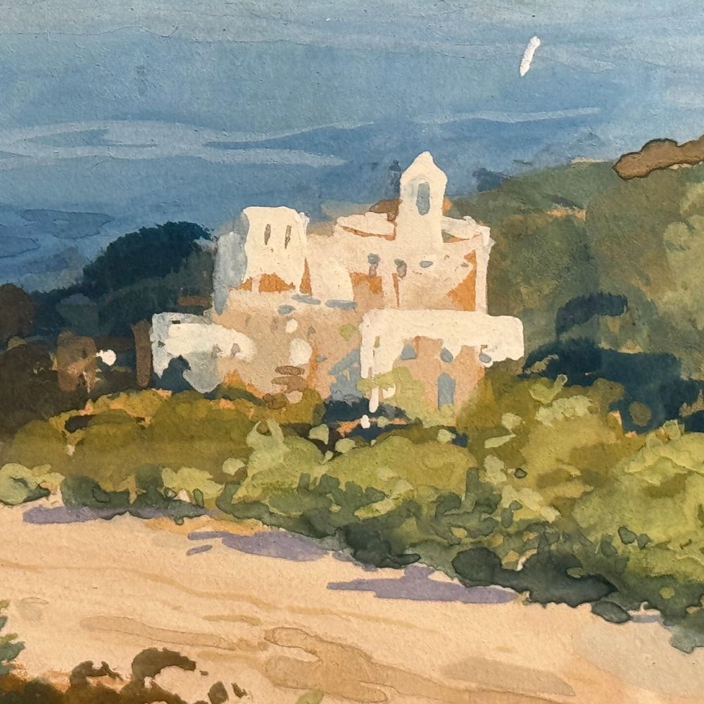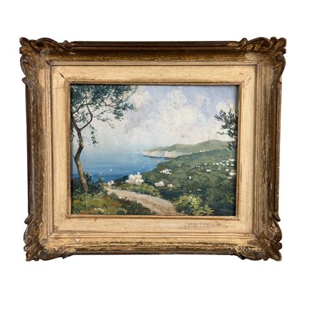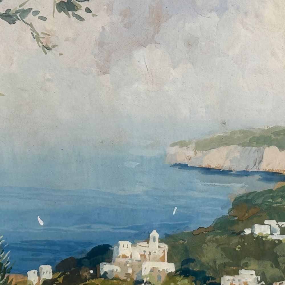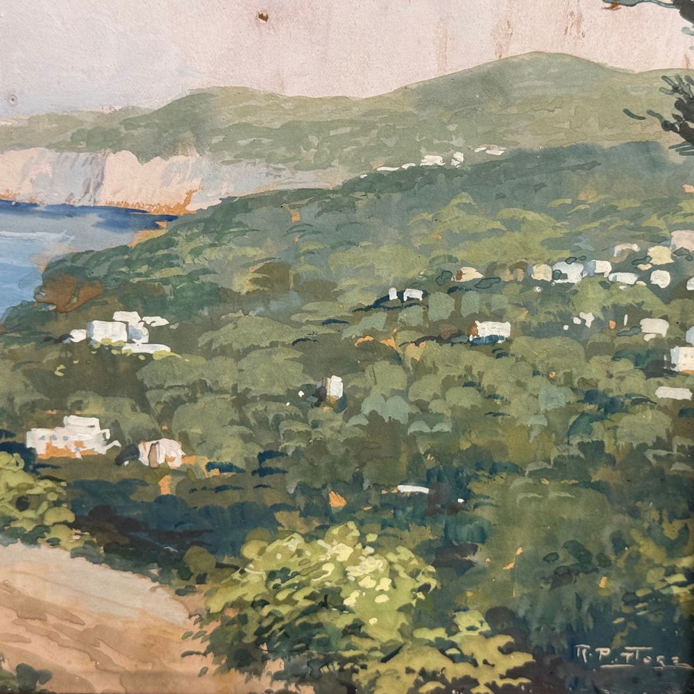 Dipinto guazzo (tempera su carta), periodo XIX/XX secolo scuola Italiana, raffigurante Sorrento. Dimensioni interno cornice: 30x24 cm. Dimensioni compreso cornice: 43x37 cm. Reca firma in basso a destra da artista non identificato. Opera in buone condizioni, cornice difetti e mancanze come da foto allegate.
