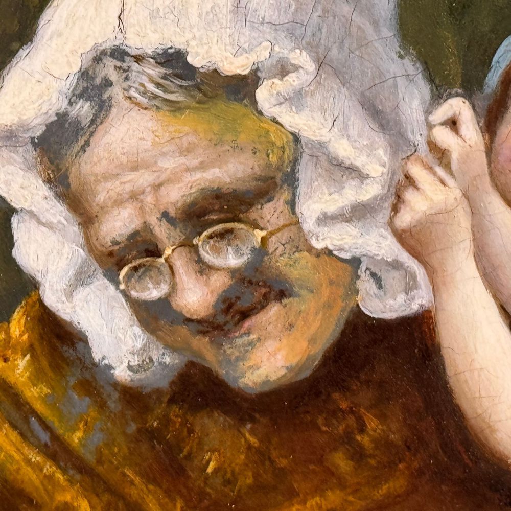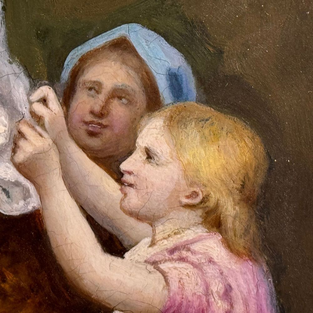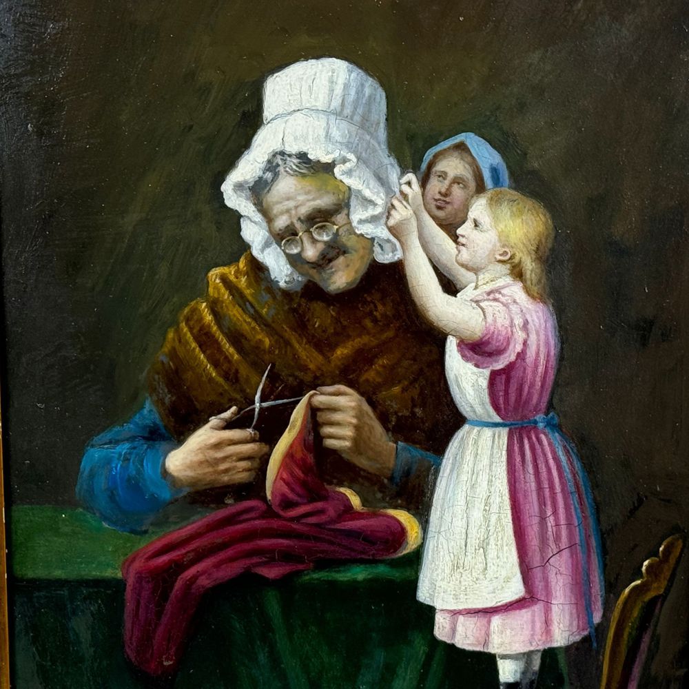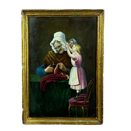 Dipinto olio su lastra di metallo, periodo 1926 inizio XX secolo, scuola Europea, raffigurante Coccole alla nonna. Dimensioni interno cornice: 28x41 cm. Dimensioni compreso cornice: 32x45 cm. Reca firma e data in basso a sinistra di difficile lettura. Opera in buone condizioni con segni di vissuto come da foto allegate.