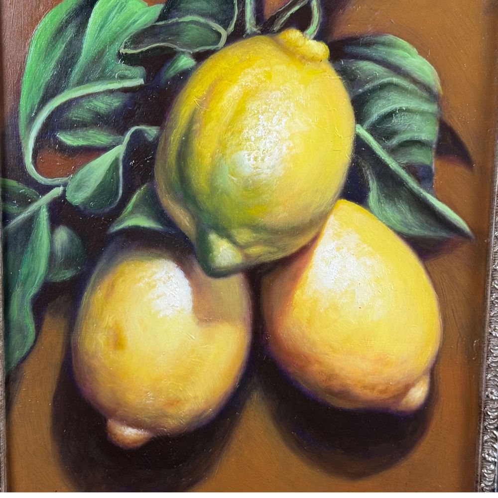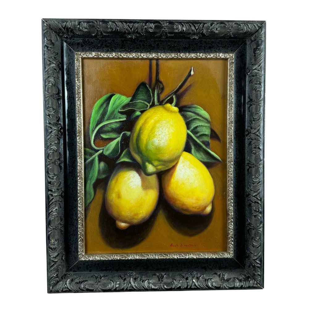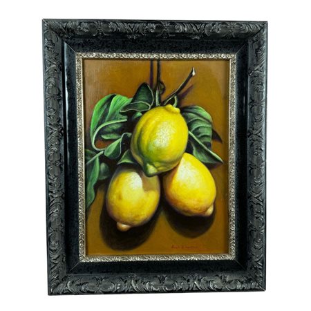 Dipinto olio su pannello, periodo XX secolo, scuola Italiana, raffigurante Limoni. Dimensioni interno cornice: 30x40 cm. Dimensioni compreso cornice: 44x54 cm. Reca firma in basso a destra da Renato Di Martino (1945 - Napoli). Opera in buone condizioni.