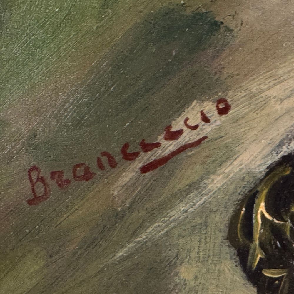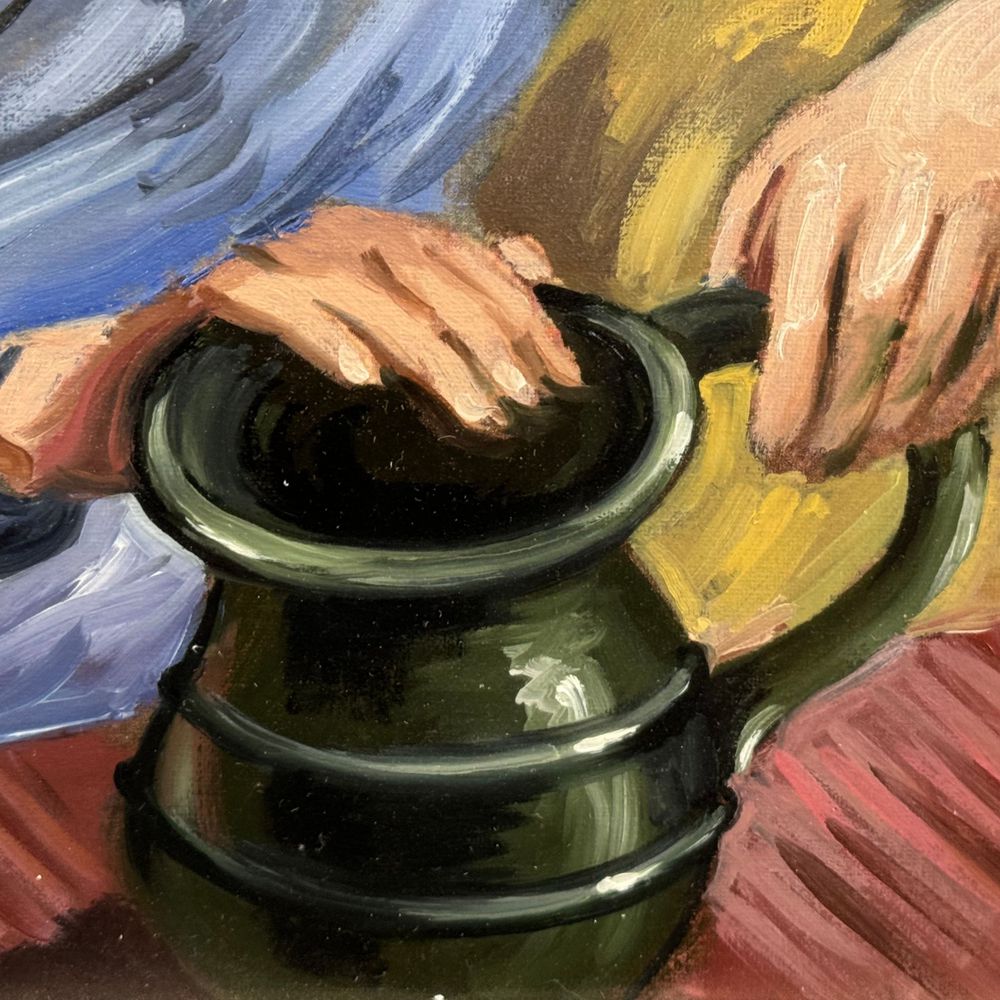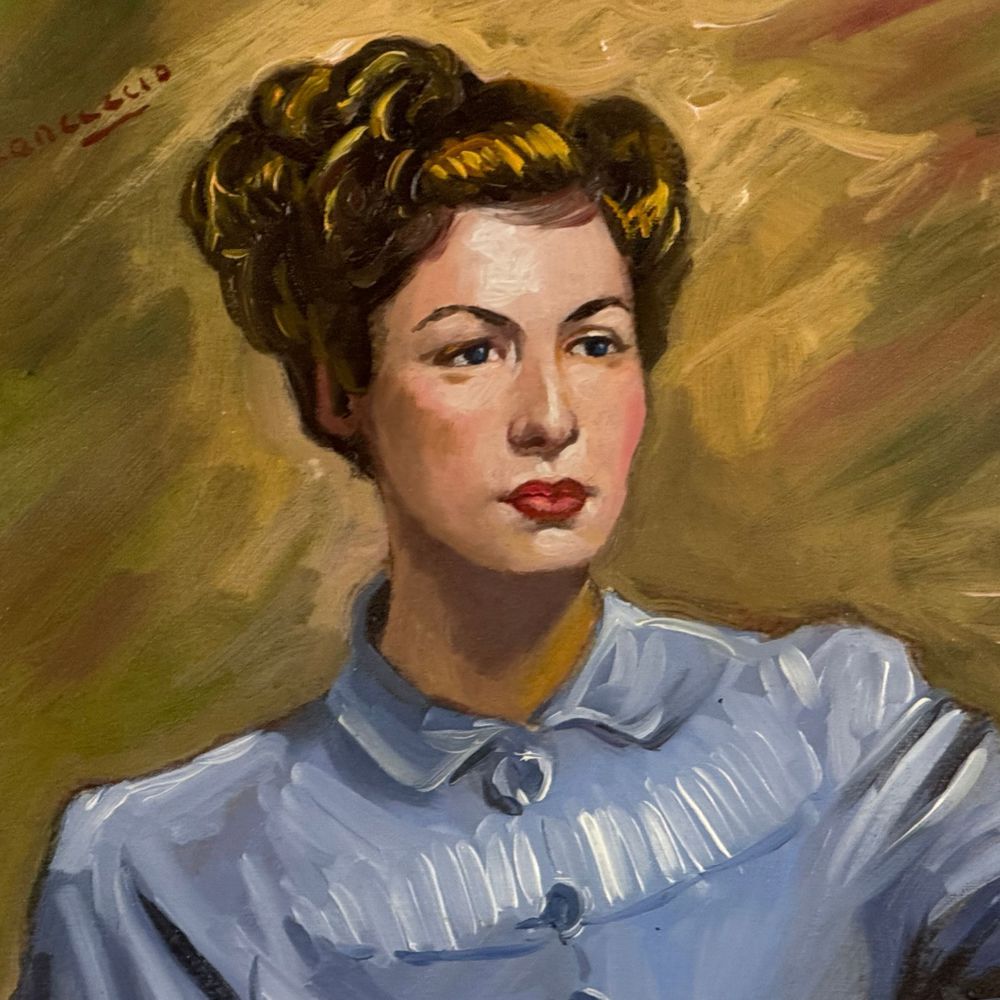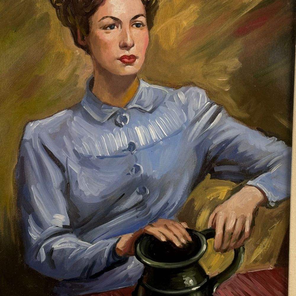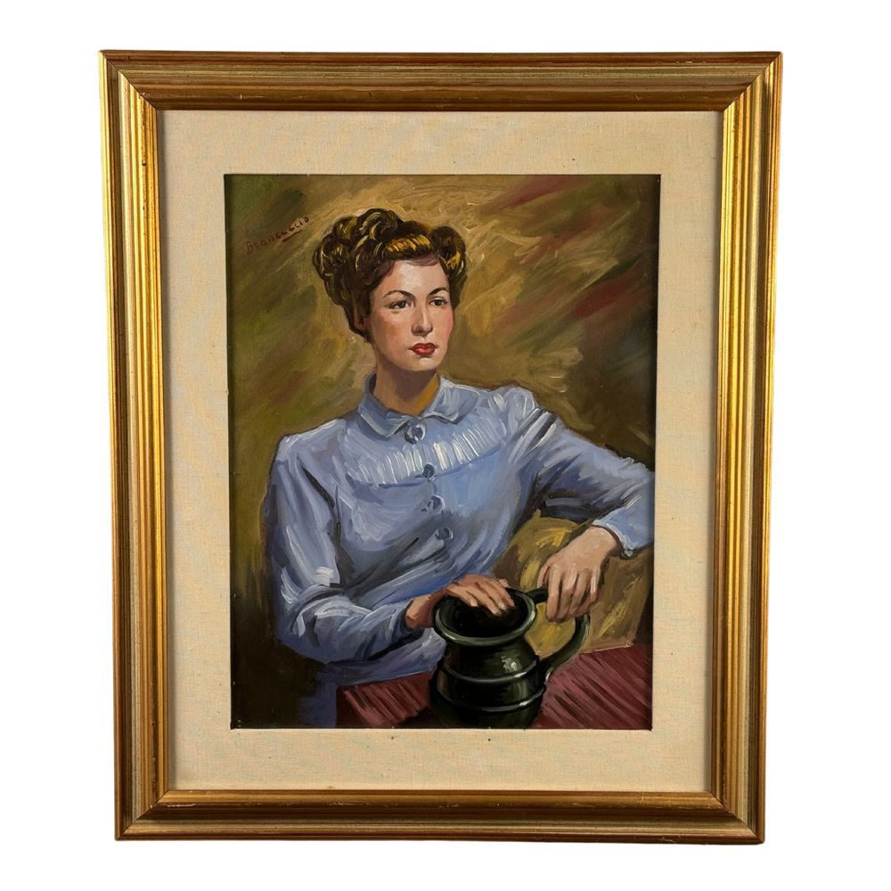 Dipinto olio su tela applicata su cartoncino, periodo XX secolo scuola Italiana, raffigurante Ritratto di donna con brocca. Dimensioni interno cornice: 35x45 cm. Dimensioni compreso cornice: 52x62. Reca firma in alto a sinistra da artista non identificato. Opera in buone condizioni.
