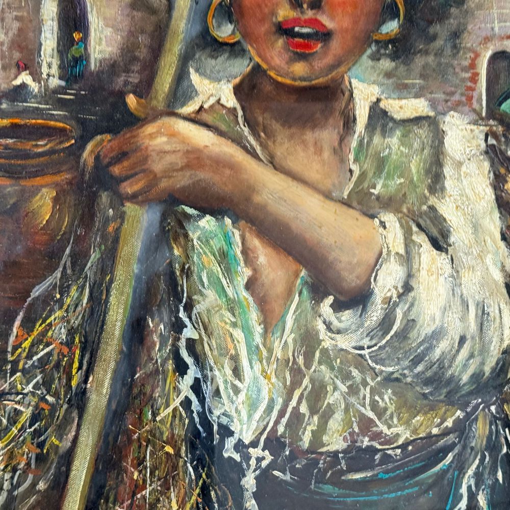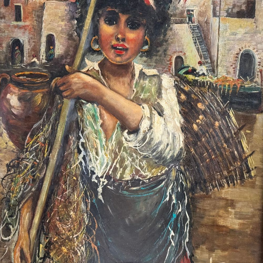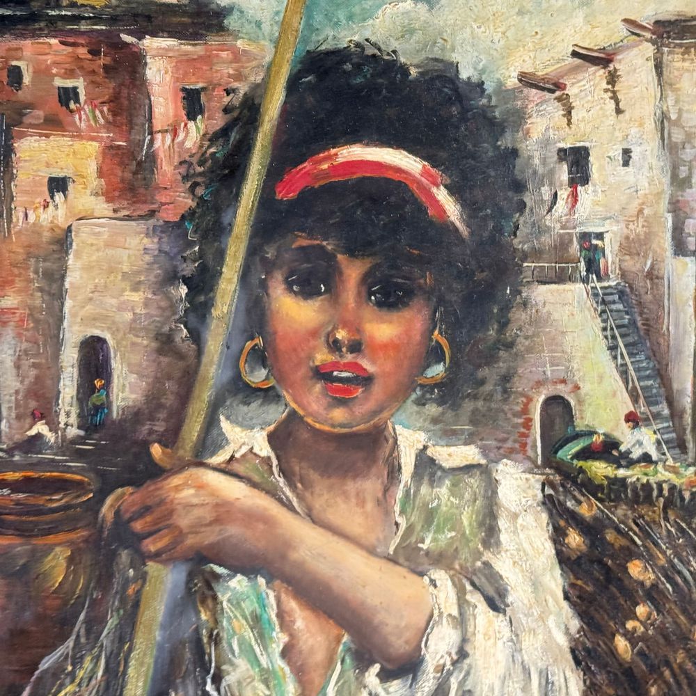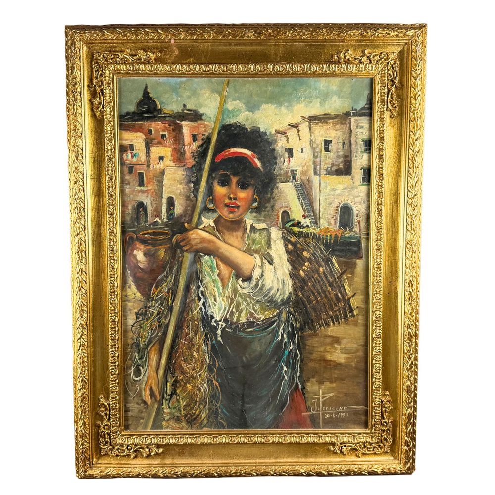 Dipinto olio su tavola, periodo XX secolo scuola Italiana, raffigurante Giovane venditrice. Dimensioni interno cornice: 50x70 cm. Dimensioni compreso cornice: 90x70 cm. Reca firma in basso a destra da artista non identificato. Opera in buone condizioni.