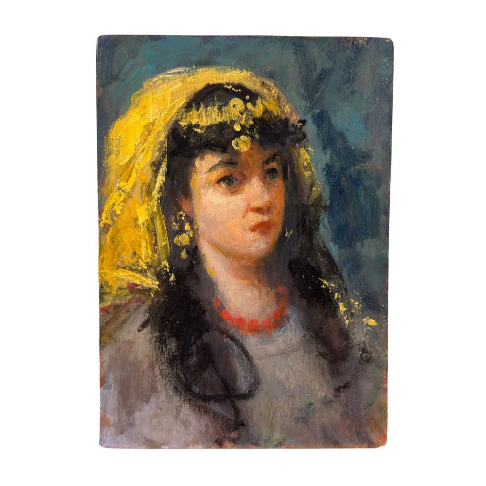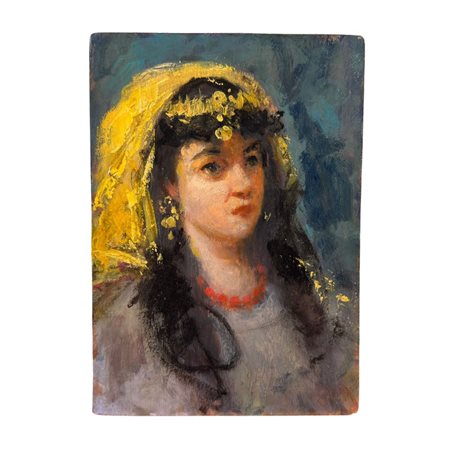 Dipinto olio su pannello, periodo XX secolo scuola Italiana, Raffigurante Ritratto di donna orientale nella maniera impressionista. Dimensioni: 24x17 cm. Da artista anonimo. Opera in buone condizioni.