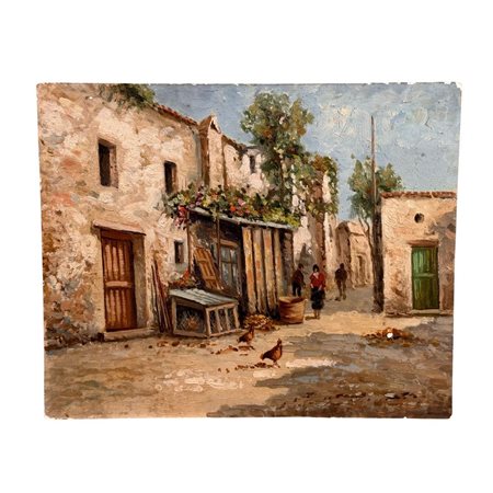 Dipinto olio su tavola, periodo XX secolo (1940 - 1950) scuola Italiana, raffigurante Scorcio di paesino. Dimensioni: 29,5x24 cm. Da artista anonimo. Opera in buone condizioni e di ottima qualità artistica.
