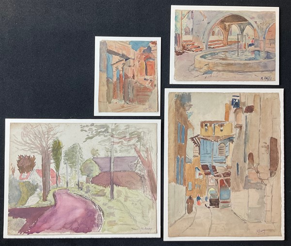 Lotto composto da quattro acquerelli e matite su carta raffiguranti scorci di città e paesaggio, di misure diverse