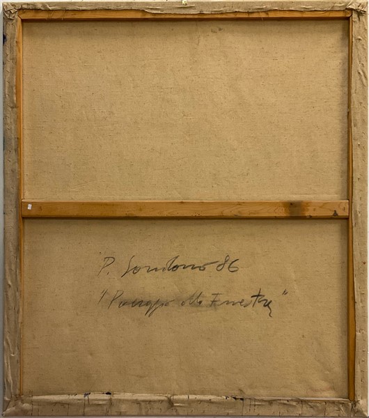 Firma indecifrata “Paesaggio alla finestra” 1986, olio su tela cm 140x120 firma