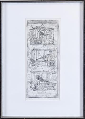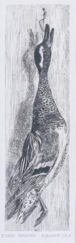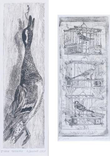 Oscar Saccorotti (Roma 1898 - Recco 1986). Lotto composto da due incisioni su carta. 1. Marzaiola, 1967. Incisione su carta. Lastra: cm 33,5x10; foglio: cm 70x50. Firmata e datata in basso a destra O. Saccorotti, 1967. Numeri di tiratura in basso a sinistra Seconda prova. Titolata in basso al centro Marzaiola. Al verso etichetta e timbro della Galleria d'Arte Sirrah, Imola.