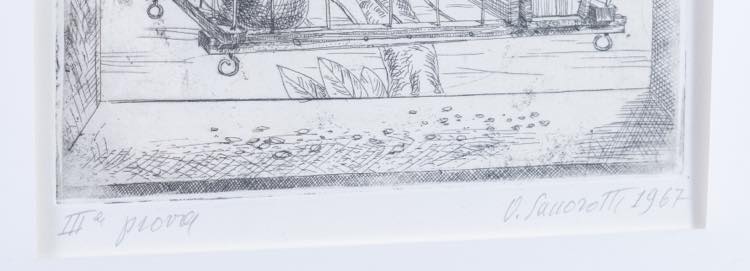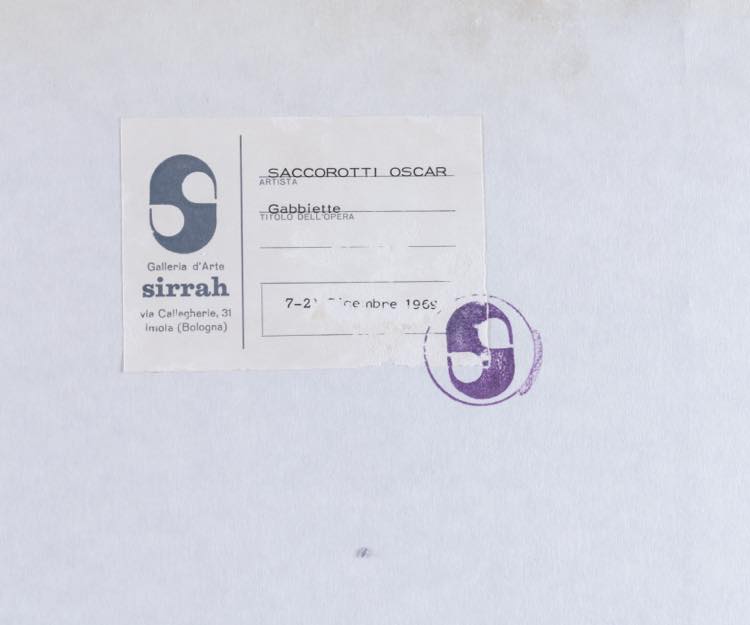 2. Senza titolo, 1967. Incisione su carta. Lastra: cm 33,5x10. Foglio: cm 70x50. Firmata e datata in basso a destra O. Saccorotti, 1967. Numeri di tiratura in basso a sinistra Terza prova. Al verso etichetta e timbro della Galleria d'Arte Sirrah, Imola.