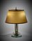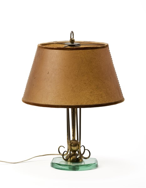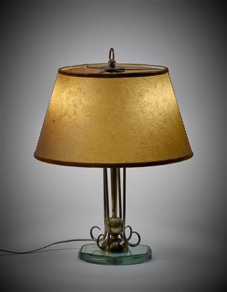 Lampada da tavolo. Italia, anni '40. Struttura in ottone e base in vetro, paralume in pergamena. (h cm 46) (lievi difetti)