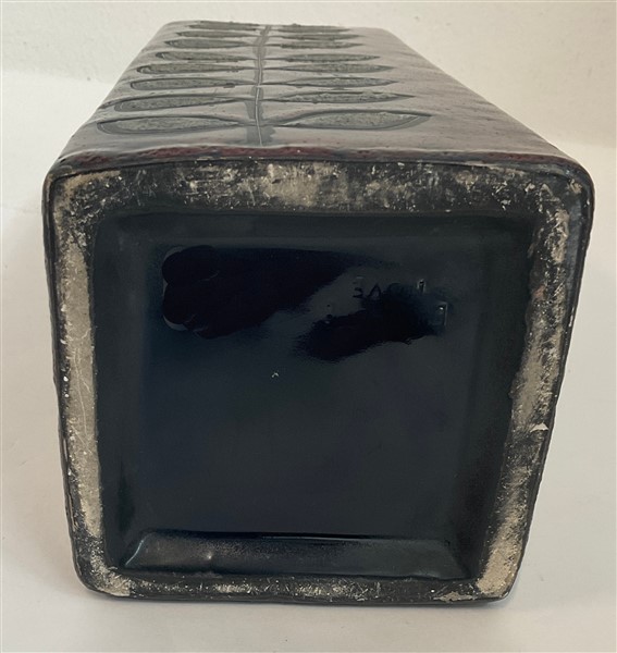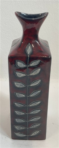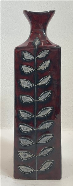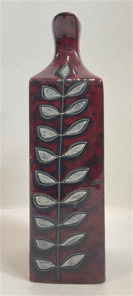 Bottiglia quadrangolare in ceramica smaltata bordeaux e decorata con motivo vegetale bianco. Nove, anni '50. Marcato sotto la base "ETRURIA ARTE NOVE". (h cm 35)