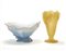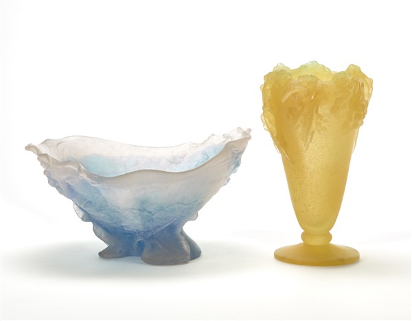 Lotto composto da un'alzata e un vaso in pasta vitrea celeste, rosa e gialla con decori floreali a rilievo. Francia, seconda metà secolo XX. (h max cm 21)