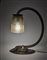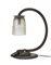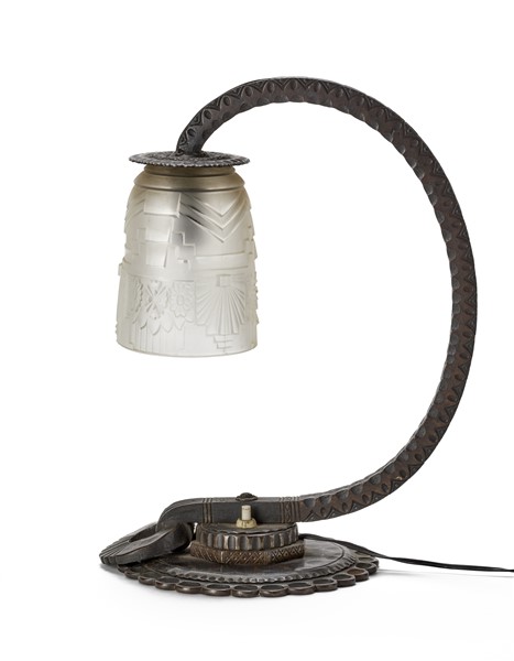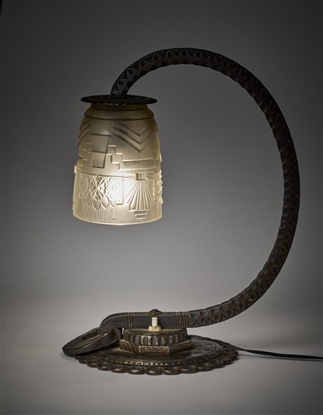 Lampada con sostegno in ferro battuto, paralume in vetro stampato e acidato con decori Art Déco. 1925. (h cm 34) (lievi difetti)