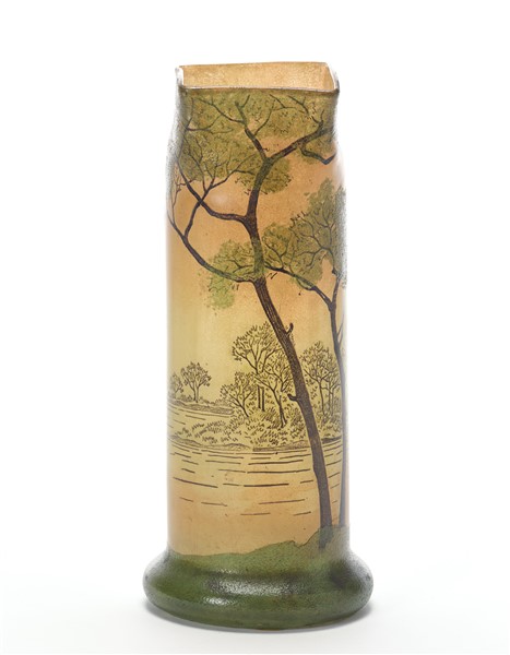 Vaso cilindrico a base allargata e bocca quadrangolare. Francia, prima metà secolo XX. Vetro soffiato decorato a smalti policromi con paesaggio lacustre. (h cm 27)