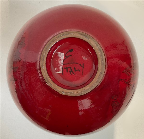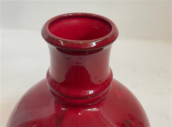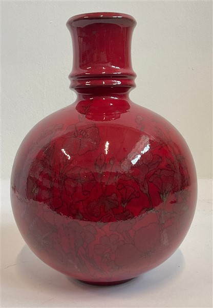 Vaso globulare in ceramica smaltata in rosso e decorata con fiori al tratto sotto vetrina. Salerno, anni '50/'60. Firmato sotto la base. (h cm 30)