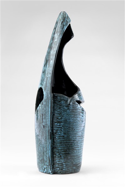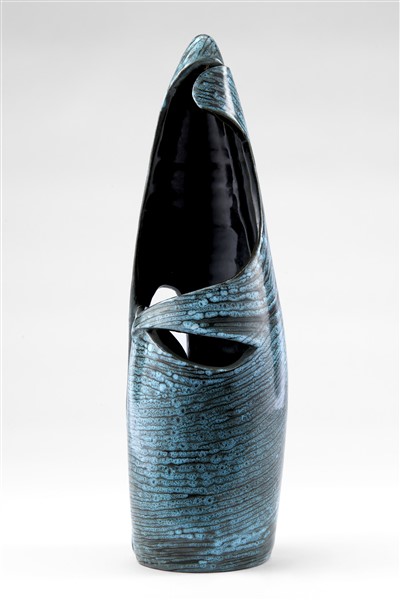Vaso irregolare predisposto per montatura a lampada in ceramica smaltata a fascie grige e celesti. Francia, seconda metà secolo XX. Firmato sotto la base. (h cm 40)
