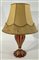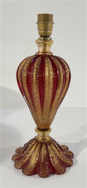 Lampada da tavolo in vetro costolato incolore e rosso trasparente con applicazione di foglia d'oro. Paralume in stoffa. Anni '70/'80. Lacerto di etichetta sul fondo. (h cm 64)