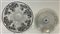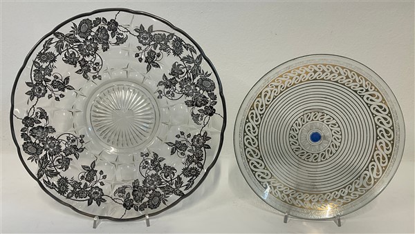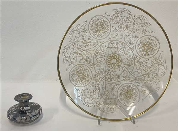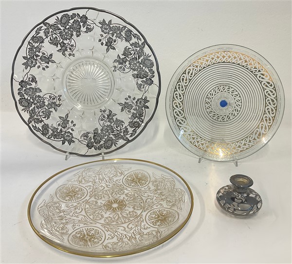 Lotto composto da tre piatti e un portaprofumo in vetro decorati con lamina d'argento e oro zecchino. Italia, seconda metà secolo XX. (d cm 36) (lievi difetti)