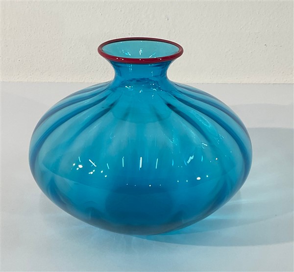 Venini Vaso. Murano, 2006. Vetro trasparente azzurro con orlo rosso applicato a