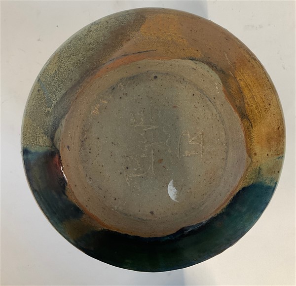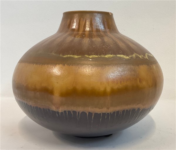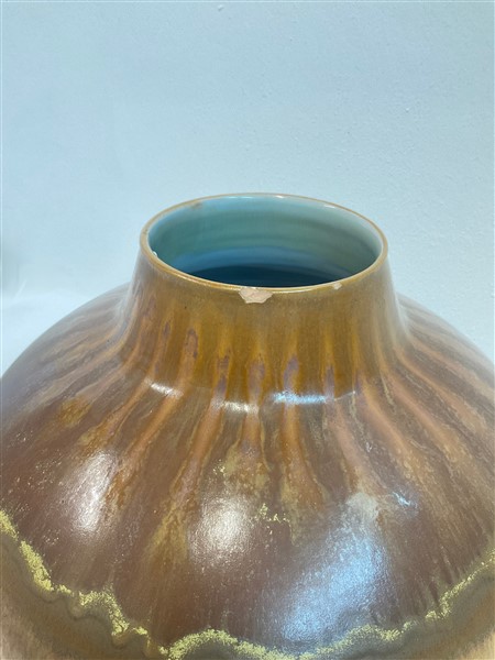 Vaso in terracotta smaltata a colaggio nei toni del marrone nella parte esterna e celeste all'interno. Italia, anni '70. (h cm 30,5; d cm 36) (difetti)