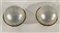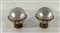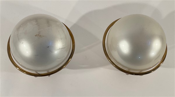 Coppia di plafoniere in ottone con diffusore sferico in vetro soffiato verniciato sulla superficie interna con effetto perlaceo. Italia, a50. (d cm 21) (lievi difetti)