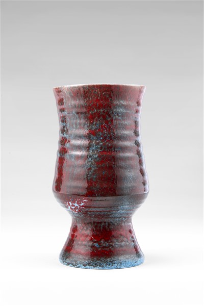 Vaso a coppa a fasce orizzontali a rilievo in ceramica lavorata al tornio e smaltata in celeste rosso e bianco. Francia, seconda metà secolo XX. Firmato sotto la base. (h cm 27)