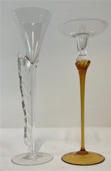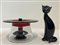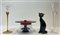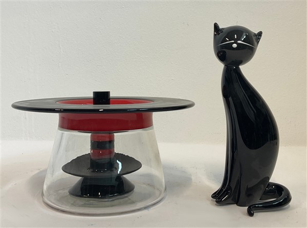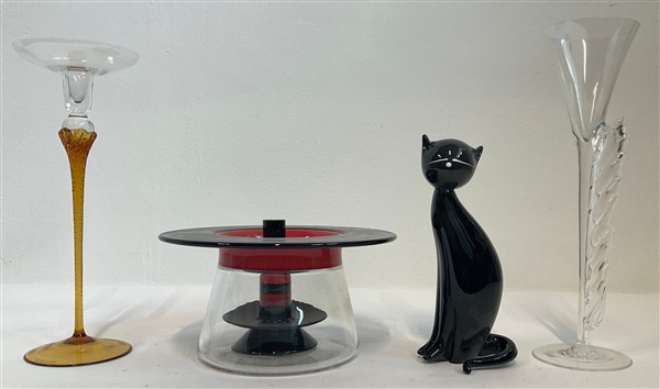 Centrotavola composto da tre elementi in vetro nero opaco, rosso opaco e trasparente di Mario Colelli per Rosenthal Glass Studio unito a un calice in cristallo marcato Rosenthal, un portacandela e un gatto in vetro marcati La Murrina. Italia, seconda metà secolo XX. (h max cm 35)