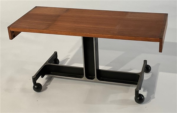 Tavolino con ruote. Italia, anni '60. Ripiano in legno impiallacciato e struttura in alluminio pressofuso verniciato nero. (cm 80x38,5x34) (difetti)