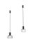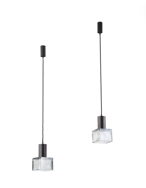Coppia di lampade a sospensione con paralume in vetro soffiato trasparente fumè e struttura in ottone verniciato nero. Italia, anni '70. (h cm 112) (lievi difetti)