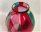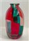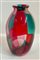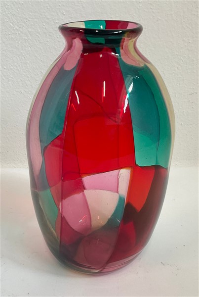 Vaso "pezzato" in vetro soffiato con tessere trasparenti pagliesco, rosse, rosa e verdi. Seconda metà secolo XX. (h cm 23)