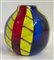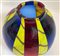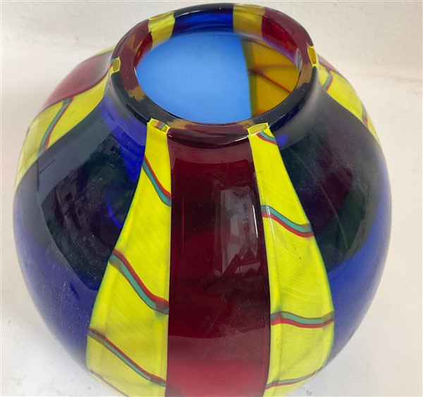 Vaso in vetro soffiato a fasce verticali trasparenti rosse, blu e giallo opaco con inserti verdi e rossi. Seconda metà secolo XX. (h cm 19)