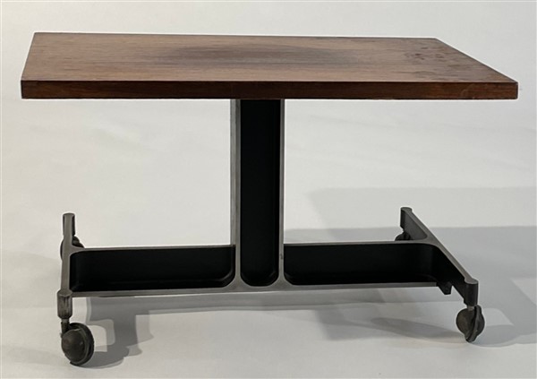 Tavolino con ruote. Italia, anni '60. Ripiano in legno impiallacciato e struttura in alluminio pressofuso verniciato nero. (cm 67x40x36,5) (lievi difetti)