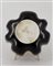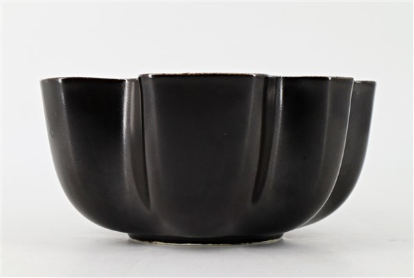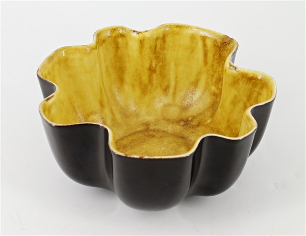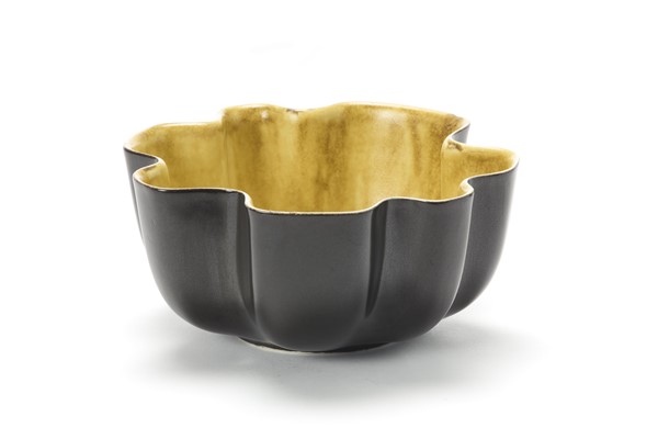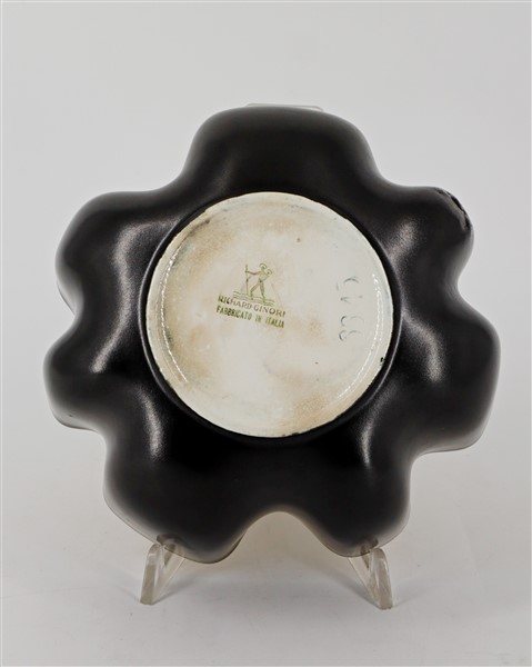 Centrotavola in ceramica a bordo mistilineo, smaltata nei toni del nero e senape. Italia, 1938ca. Marcato sotto la base. (h cm 28,5) (lievi difetti)