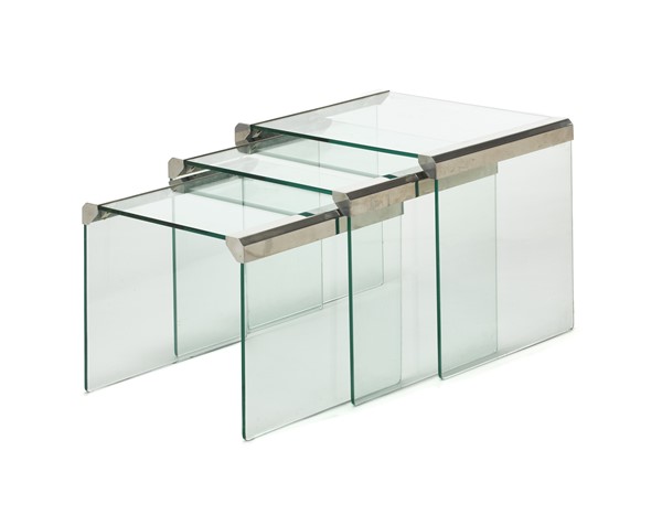 Tre tavolini a nido. Milano, anni '70. Cristallo e ottone nichelato. (cm 48x40x40) (lievi difetti)