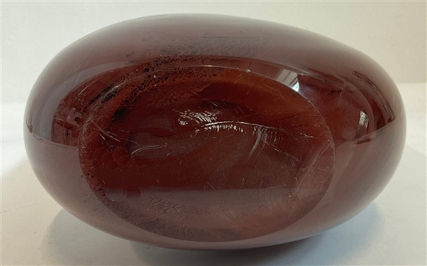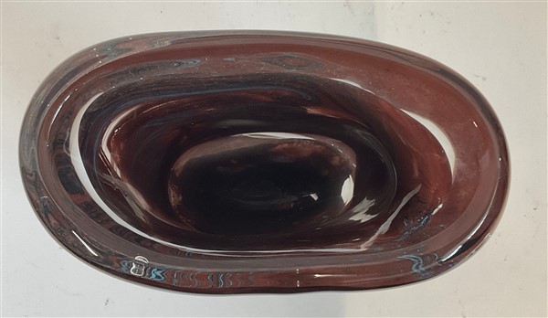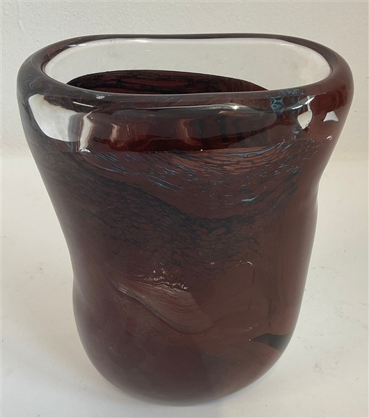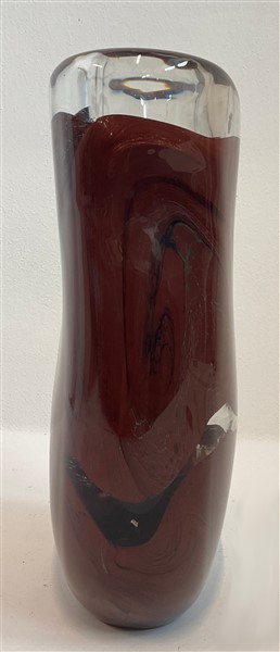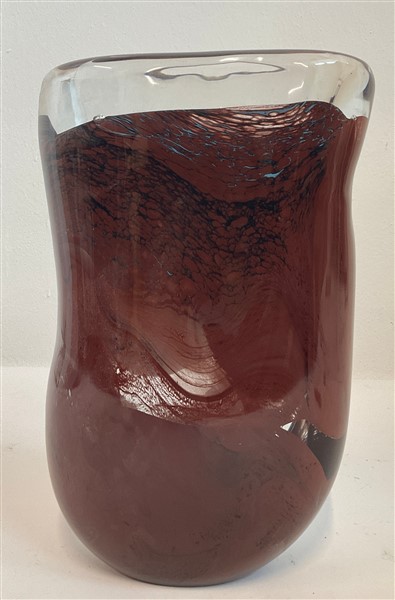 Vaso sommerso trasparente incolore e decorazione astratta nei toni del marrone, azzurro e nero. Seconda metà secolo XX. (cm 20x31x11)