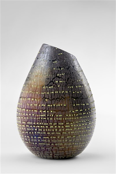 Vaso a sezione schiacciata in vetro soffiato ametista scuro di forte spessore con applicazioni a caldo di fasce in vetro giallo chiaro a forte craquelure e iridazione. Seconda metà secolo XX. (h cm 33,5)