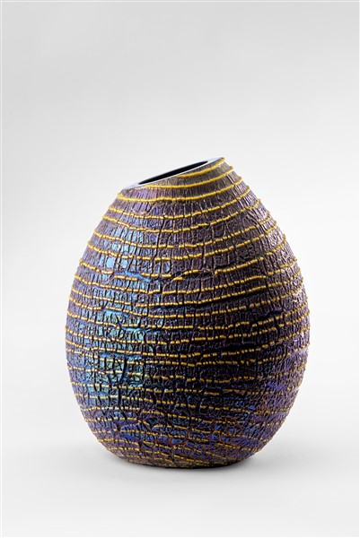 Vaso a sezione schiacciata in vetro soffiato ametista scuro di forte spessore con applicazioni a caldo di fasce in vetro giallo a forte craquelure e iridazione. Seconda metà secolo XX. (h cm 30)
