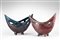 Coppia di grandi centrotavola in ceramica smaltata rispettivamente nei toni del bruno e del blu petrolio e del rosso ruggine e del bruno. Francia, seconda metà secolo XX. Firmato sotto la base. (cm 47x33,2)