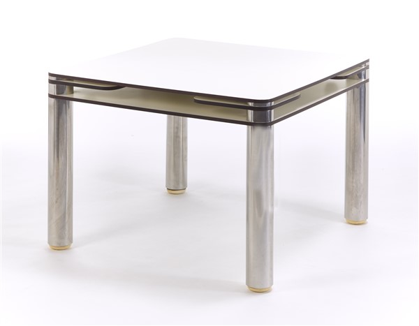 Tavolo da gioco modello "Poker". Produzione Zanotta, Italia, 1968. Gambe in tubolare d'acciaio inox 18/8, doppio piano in laminato plastico stratificato di colore bianco, quattro sportelli posacenere estraibili