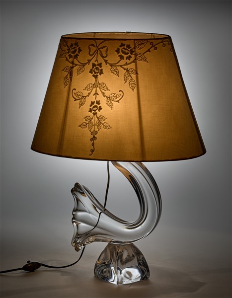 Daum Lampada in vetro trasparente con paralume ricamato da Olga Asta. Firmata al