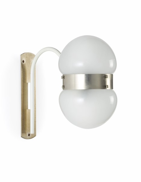 Una applique in metallo e doppio diffusore globulare in vetro incolore acidato sulla superficie interna, struttura in acciaio inox e metallo laccato bianco. Italia, anni '60. (h cm 30) (lievi difetti)