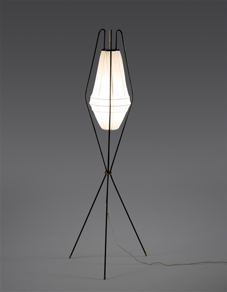 Lampada da terra. Italia, anni '60. Struttura in tondino di metallo verniciato nero e ottone e paralume in tessuto bianco. (h cm 149) (lievi difetti e restauri)