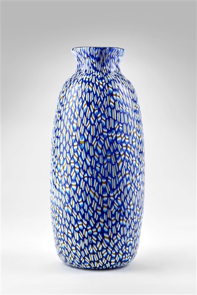 Vaso in vetro soffiato a murrine nei toni del blu, lattimo, giallo e celeste opaco. Seconda metà secolo XX. (h cm 34)