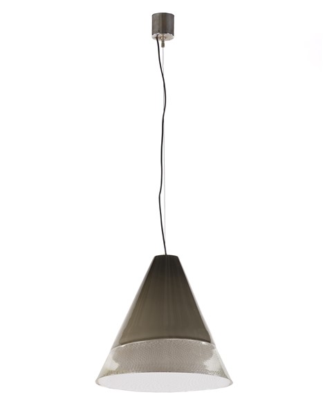 Lampada a sospensione in vetro soffiato a incalmo incamiciato grigio e incolore con inclusione di bollicine. Murano, anni '70. (h cm 125; d cm 43) (lievi difetti)